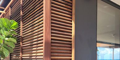 We specialize in custom louvers that cover windows, stucco, or any area desired. Louvers can be made of many materials. Ipe is used in the picture above.